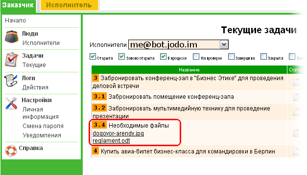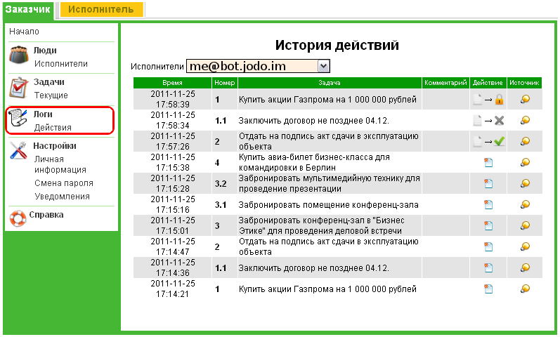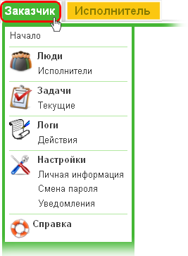 В левой части окна вы увидите две вкладки: "Заказчик" и "Исполнитель". Нажмите на вкладку "Заказчик" - это и есть основное рабочее место руководителя на сайте. В блоке "Люди" перечислены все ваши сотрудники, в блоке "Задачи" - дерево всех поставленных задач, в блоке "Логи" - хронология изменений статусов заданий и появления комментариев, а в блоке "Настройка" - ваши личные данные, инструмент смены пароля и управления рассылками от . Основное назначение сайта - удобная работа с деревом задач, так как в работе через jabber есть некоторые ограничения.