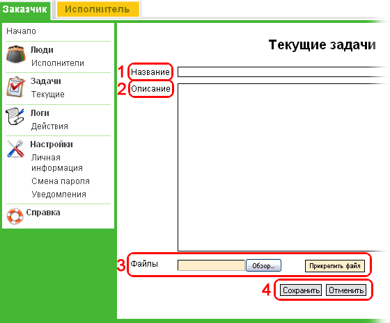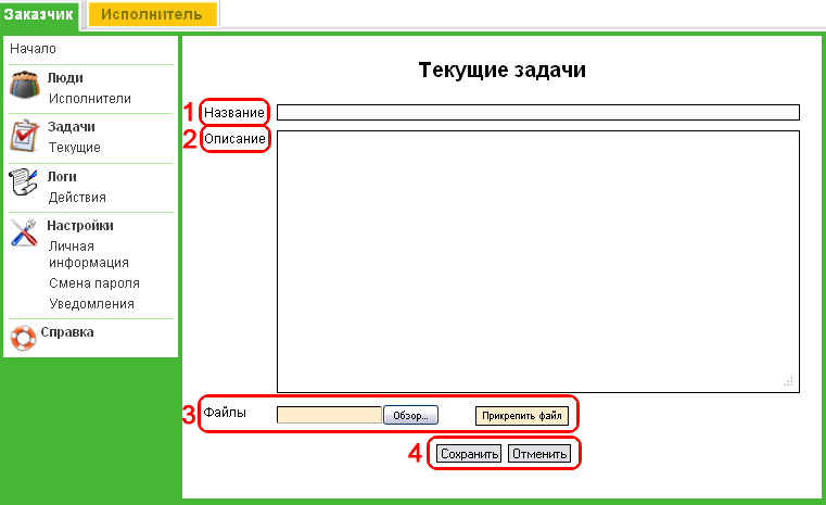 Чтобы создать новую задачу, заполните поля "Имя" и "Описание". Через сайт можно добавлять к заданиям необходимые файлы. Для этого нажмите на кнопку "Обзор", выберите необходимый файл и нажмите "Прикрепить файл" (3). Сохраните готовую задачу.