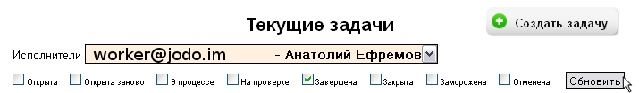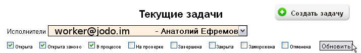 1 - Окно для выбора исполнителя. Если у вас есть несколько сотрудников, которые работают через систему, выберите здесь Jabber ID того, чьи задачи хотите посмотреть.